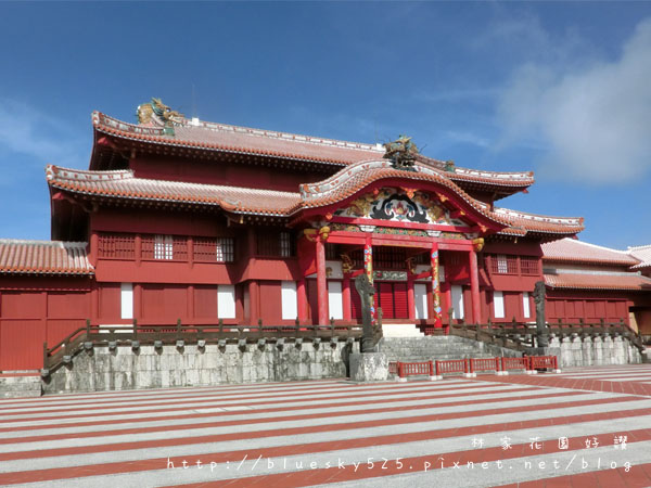 ▲首里城中最醒目的建築正殿原來是琉球國王處理公事和舉行重要儀式的地方。它是沖繩島最大的木結構建築之一,有鮮明的琉球風格,並且糅合了中國和日本傳統建築的特點,形態宏偉,色彩鮮豔。正殿的雙層建築與北京故宮的太和殿極其相似,只是規模小一些,161根大柱子,6萬片紅瓦片,還有非常講究的金獅飛龍等多種雕塑,充分的顯示了琉球王朝的輝煌歷史。琉球在1372年便開始與中國產生貿易關係,交流持續了大約500年。直到19世紀日本明治維新以後,它才成為日本的1個縣,開始被日本同化。當地人說,琉球王國最強盛的時候就是和中國關係密切的時期。