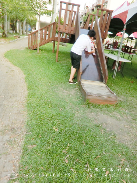 ▲草皮上還有木式的溜滑梯給孩子們玩