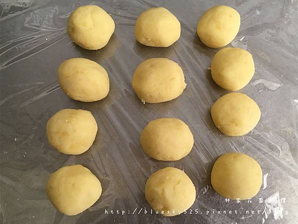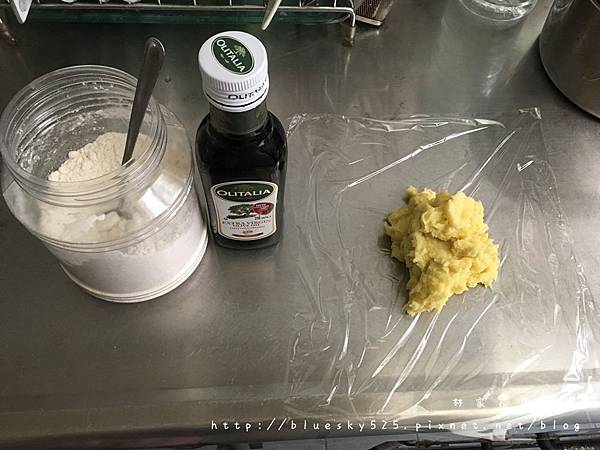 2.馬鈴薯蒸熟後(蒸出的水倒掉)趁熱壓成泥,慢慢加入奶油攪拌均勻