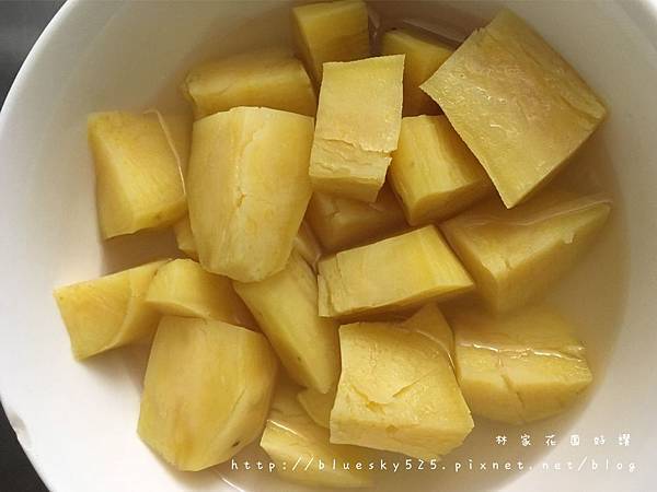 ▲1.地瓜削皮後放在容器內加水蓋過地瓜,進電鍋蒸,外鍋1杯半