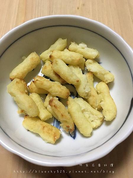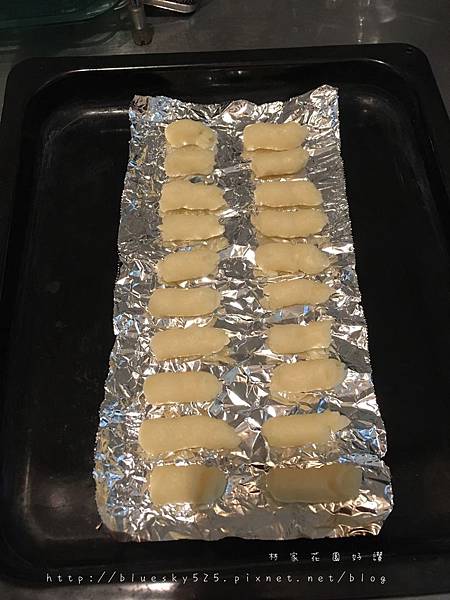4.將拌好的馬鈴薯泥裝入塑膠袋,角角剪一小洞擠出小條狀在烤盤上即可