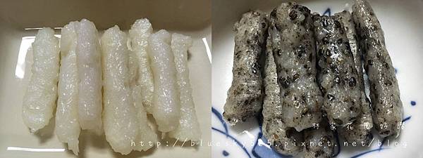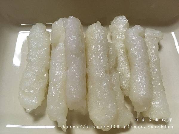 1.蒸好的飯(飯的乾濕度很重要,太乾或太濕都會失敗,煮飯時大概是米1:水1.2,蒸好放涼就可以)加1保特瓶蓋的開水,打成麻糬狀,裝在塑膠袋,角角剪一小洞(因為量很少,所以我是用隨行杯果汁機打的)